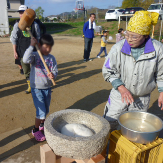 【お餅つき】毎年12月第2土曜は恒例のお餅つき大会。つきたてのお餅は、その場できなこやあんこぜんざいにしていただきます。